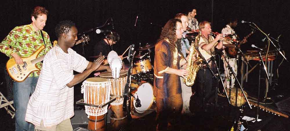 ZubopGambia is a collaboration of London-based worldbeat music group Zubop with Gambian master musicians Njega Sohna (djembe, talking drum, vocals) and Solomelo (vocals and guitar), now joined by Fela Kuti’s niece Molara, inspirational female force and for 14 years the voice of dub pioneers Zion Train. ZubopGambia brings together the musical interests and influences of everyone involved - the performance includes not only traditional West African pieces, but elements of jazz, township music, pop, reggae, blues and many other styles. The Observer made our CD Live at Ronnie Scott's album of the week, praising it as “irresistible, high spirited and full of fun” and fRoots magazine wrote “there’s a spark about it all which is downright infectious.” Visit our MySpace site to hear live tracks and see video footage from our latest tour. To see where we'll be playing next you can look at our list of dates/places.